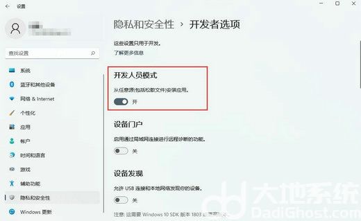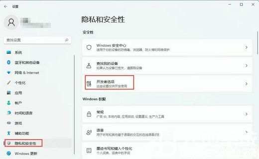 2、进入界面后,在界面中找到并打开隐私和安全性选项,之后左边会出现它的列表,在列表中进入开发者选项的页面