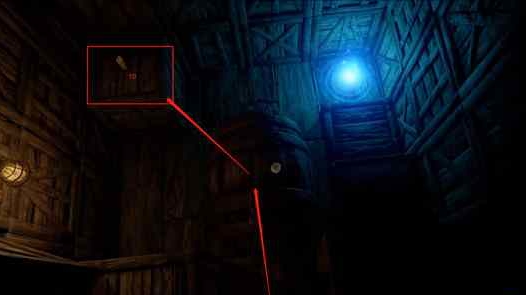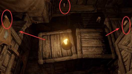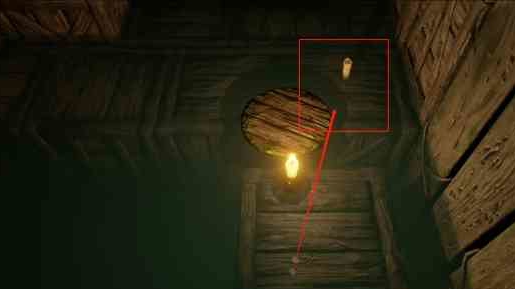 2、然后把飘在水面上的圆木板往里推,然后垫脚跳上去能找到一个蜡烛,看到隔壁有个板子,下面有一个蜡烛,点亮即可。