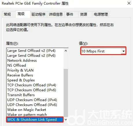 随后在弹出的属性窗口中将鼠标切换至“高级”选项,找到其中的“WOL & Shutdown Speed”并将右侧的“值”改为“10 Mbps First”,最后点击“确定”保存设置。