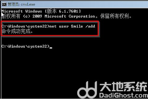 4、接着继续输入“net localgroup administrators Smile /add”然后按回车确定,命令成功后继续输入shutdown /r /t 5 /f“”回车确定。