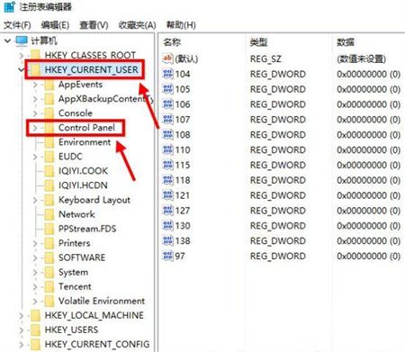 2、选择第二项HKEY_CURRENT_USER点击进入。进入后点击Control Panel进入;