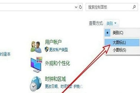 3.接着,在打开的控制面板的窗口中,点击右下角的“查看方式”下拉按钮,在弹出菜单中选择“大图标”的菜单项;