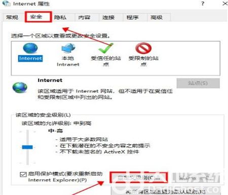 2、在打开的lnternet属性中将选择安全栏目,然后下拉找到“自定义级别(C)”,鼠标单击进入。如图所示: