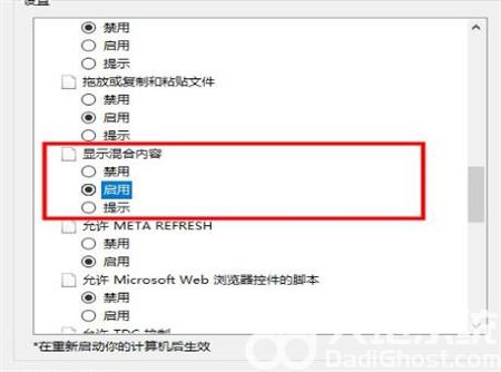 4、然后继续找到【显示混合内容】将其修改为启用,然后点击确定保存设置。如图所示: