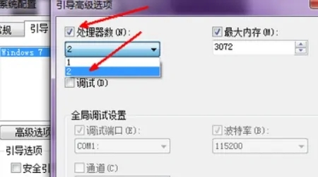 5、这个处理器数前面的复选框 默认不是选定的,用鼠标选定它,然后点击下面的菜单,选择2,点击确定退出。
