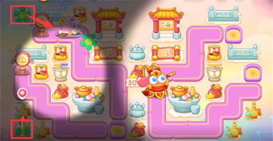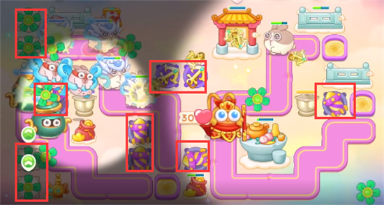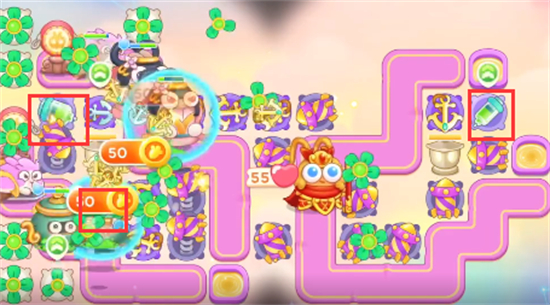 1、这一关我们可以选择的炮塔为毒针、风扇、船锚、烟花、泡泡塔,月亮,这一关我们使用风扇+船锚输出。