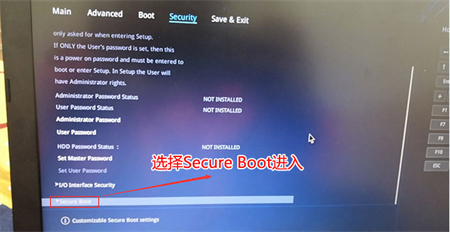 3.进入高级模式后,按→方向键移动到Security,选择Secure Boot,然后回车进入把Secure Boot control选enabled改为disabled关闭安全启动;