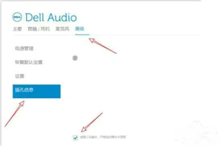5、这时我们会进入"Dell Audio",然后我们点击"高级"后再进入"插孔信息",将下方的"当插入设备时,自动开启弹出对话框"勾选;