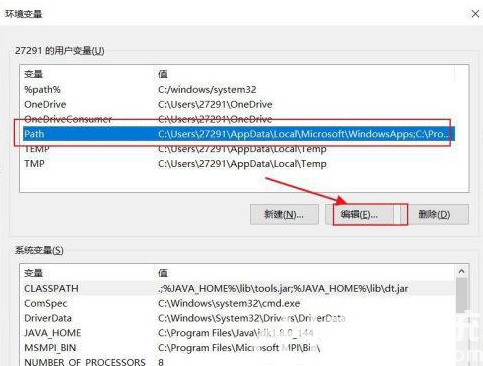 5、在用户变量中找到:Path,点击编辑。