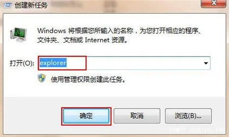 2、点击“文件—新建任务”,在弹出的“新建任务”窗口中输入“explorer”命令后点击确定,如下图所示: