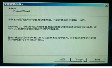 4、阅读完"华硕预载向导"画面后点击【Next】(下一步);