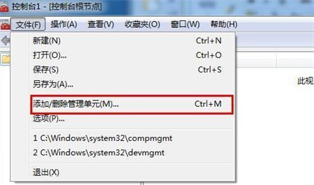 2、进入新窗口之后,点击“文件”选项中的“添加/删除管理单元”;