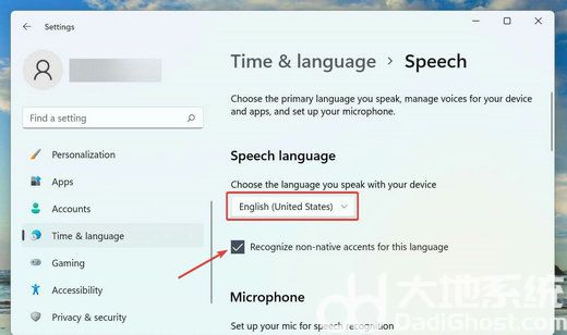 现在,从“选择您使用设备使用的语言”下拉菜单中选择所需的选项,然后勾选“识别此语言的非母语口音”选项的复选框。
