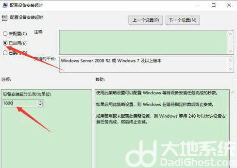 4、在窗口左上方选择“已启用”,然后在左边中间位置“设备安装超时”中设定“1800”秒后单击确定,此时看到“配置设备安装超时”处于启用状态,然后尝试重新启动声卡安装程序。