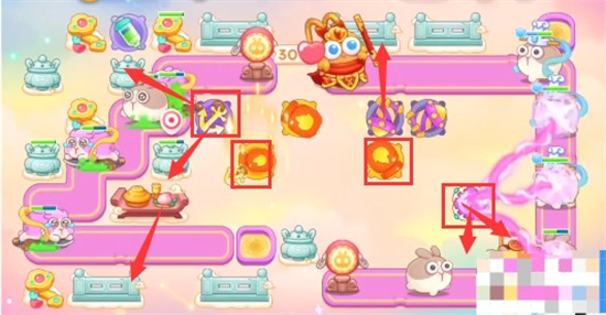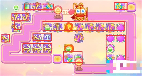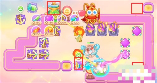 1、这一关需要使用的炮塔是:船锚、魔法球、泡泡塔、火瓶、毒针、烟花,我们使用火瓶开图,船锚输出。