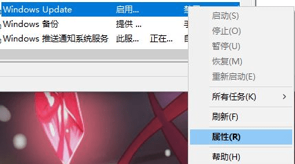 2、找到"Windows Update”选项,右键选择【属性】打开。