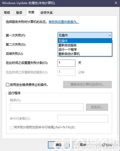 4、然后点击恢复,将“第一次失败”改为“无操作”,最后点击确定,这样就能彻底将自动更新禁用了。