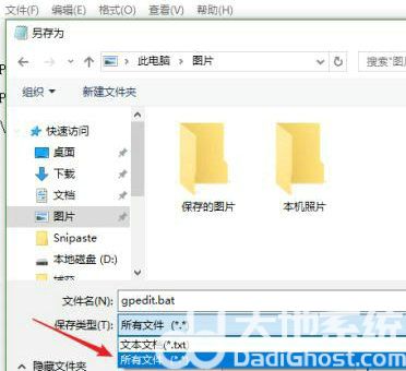 4、在弹出的界面中选择保存路径、文件名(这里命名为gpedit.bat),注意文件类型为“所有文件”,只有这样才能保证gpedit.bat是一个批处理文件。