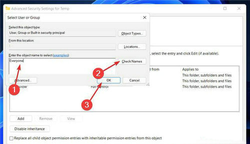 6、在 Select User or Group 窗口中,在Enter the name to select下方的框中 键入 Everyone ,然后按Check Names按钮,然后按OK。