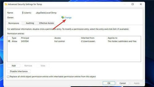 5、在Temp的 Advanced Security Settings窗口中,单击Owner 旁边的 Change超链接 。