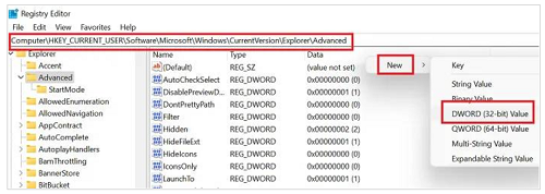 1、按 Win+R 打开运行窗口并在运行字段中键入命令regedit。按 Enter 打开注册表编辑器窗口。然后,导航到以下键:HKEY_CURRENT_USER\Software\Microsoft\Windows\CurrentVersion\Explorer\Advanced在右侧窗格中,右键单击空白区域的任意位置,然后选择New > DWORD (32-bit)。