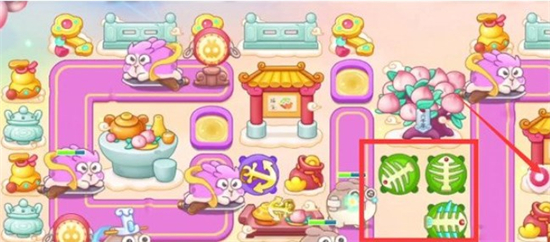 3.先将红框位置的酒桌打掉,再将船锚附近的钱袋打掉,空出的位置放置船锚,鱼骨刺可以开始攻击桃树了。