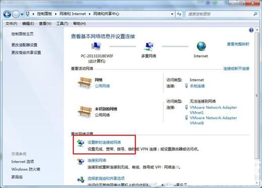 3、打开网络和共享中心窗口中,选择“设置新的连接或网络”。