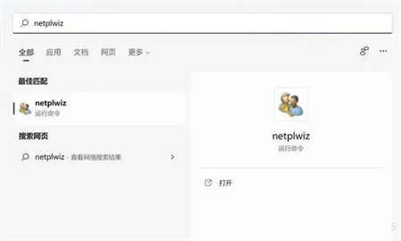 在 Win11 中,根据搜索找到“运行”,随后运行下列命令:netplwiz