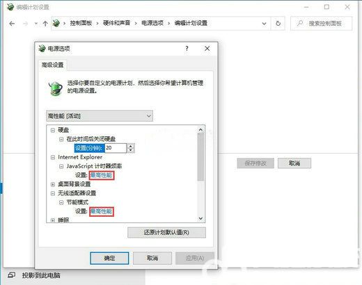 6、接着,在电源选项窗口,将 Internet Explorer 和无线适配器设置为【最高性能】;