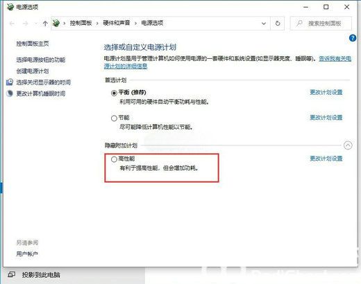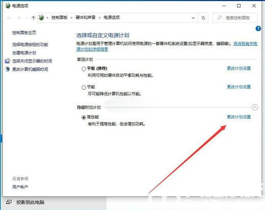 4、路径:控制面板 - 硬件和声音 - 电源选项,选择【高性能计划】,并点击【更改计划设置】;