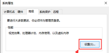 3、系统属性窗口,切换到【高级】选项卡后,再点击性能(视觉效果,处理器计划,内存使用,以及虚拟内存)下的【设置】;