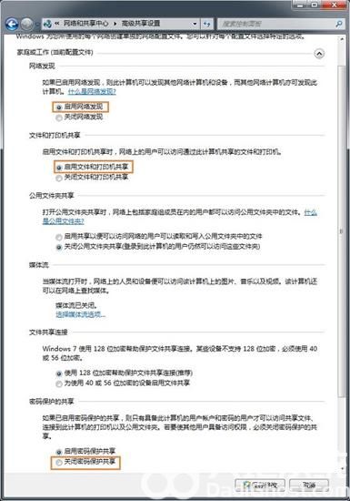 3、再点击“网络和共享中心/更改高级共享设置”,在“家庭或工作(当前配置文件)”中启用“网络发现”和“文件和打印机共享”, 如不需要访问密码,可以关闭“密码保护的共享”;