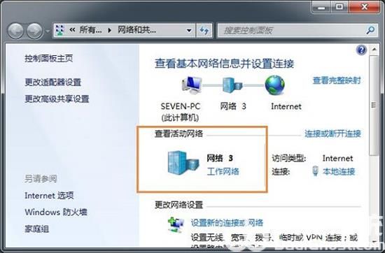 2、接着在打开“控制面板/网络和共享中心”,点击“查看活动网络”下方的图标,将网络属性设置为家庭或工作;