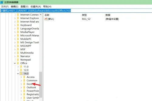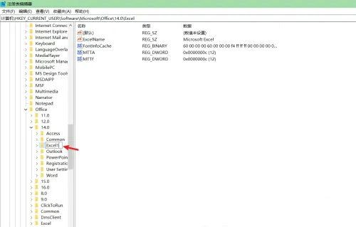 在注册中找到计算机\HKEY_CURRENT_USER\Software\Microsoft\Office\14.0下面的excel文件夹。
