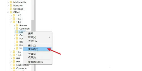 右键注册表中excel文件夹,并选择重命名为excel1。