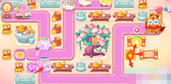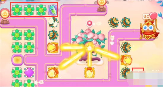 1、本关能够使用的炮塔是:毒针、魔法球、多重箭、风扇、火瓶,这一关我们比较好用的输出是风扇和火瓶。