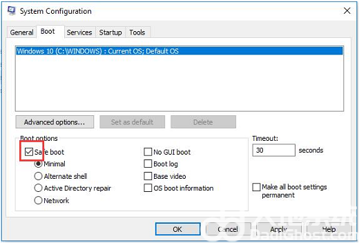 2、然后在“ Boot”选项卡下,选中“ Safe boot ”框,然后单击“ Apply”和“ OK”。