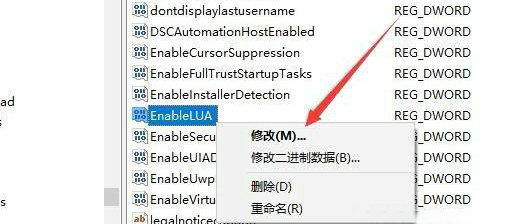 第5步右键点击enablelua注册表键值,在弹出菜单中选择“修改”菜单项。