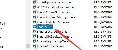 第4步在右侧打开的窗口中找到enablelua注册表键值。