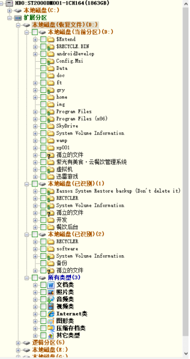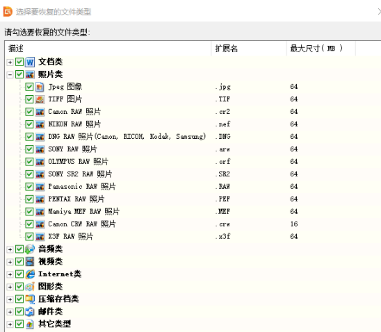 这里有几百个文件类型,基本上您常接触到的文件类型都在这里了,默认是全都勾选了,您可以只勾选需要恢复的文件类型,可以简化“所有类型”的恢复结果。