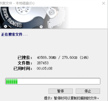 设置好恢复选项,点击“开始”按钮后,DiskGenius软件就开始扫描硬盘或分区中的数据了,首先会弹出一个扫描窗口。