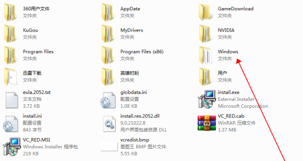 3、C盘打开界面找到并双击【Windows】打开文件夹;