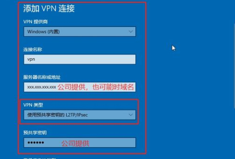 5.然后连接名称写"VPN"服务器名称由公司提供,共享密钥下填写公司提供的密钥填写完后,点击“保存”按钮。