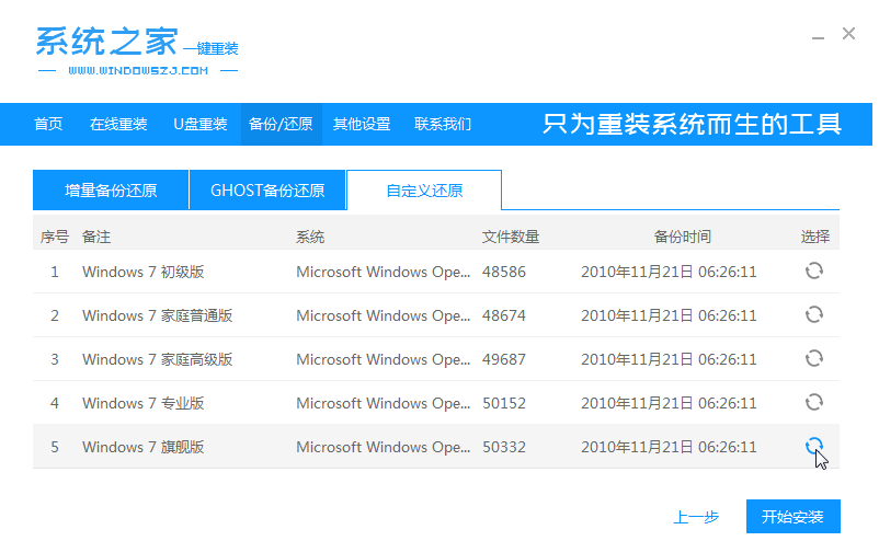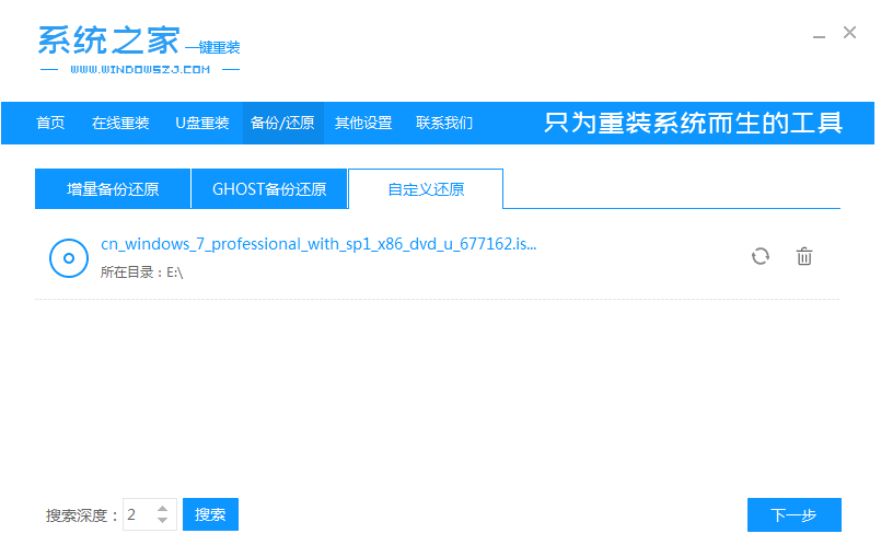 3、切换到“自定义还原”功能选项,在出现的本地磁盘镜像中,点击还原按钮,进入下一步。