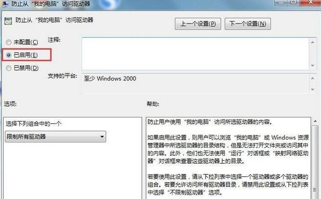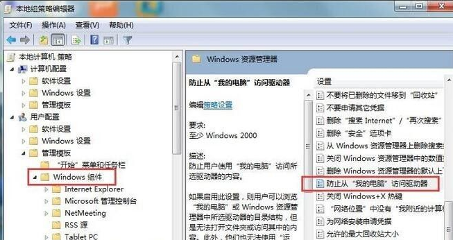 2、在窗口中,依次打开:用户配置→管理模板→Windows组件→Windows资源管理器,在右侧找到并打开防止从“我的电脑” 访问驱动器,如图所示: