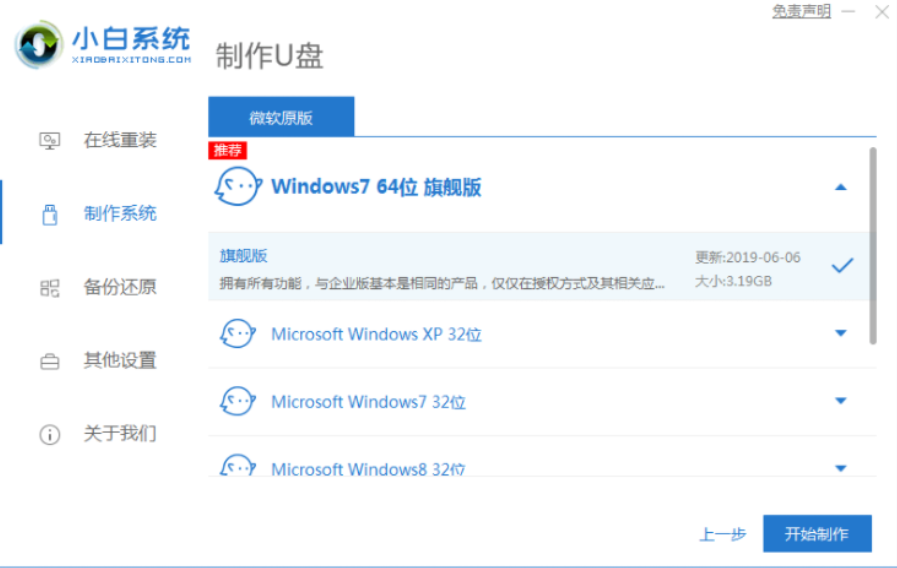 2、进入系统选择界面选择需要安装的系统,点击“开始制作”。