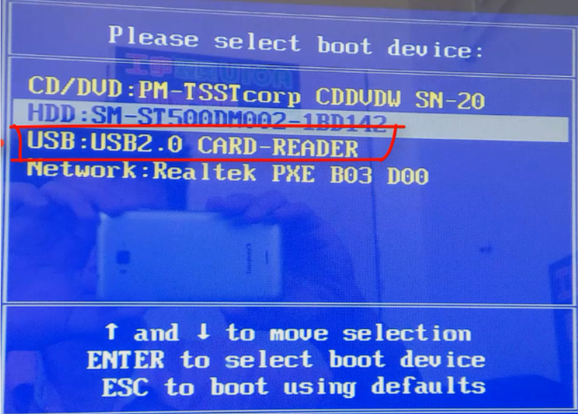 4、u盘插入需要重装的电脑,并重启电脑快速断续的按启动热键进入快速启动界面,选择带USB开头的u盘启动项回车键进入。