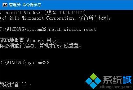 2、输入命令netsh winsock reset并点击回车。
