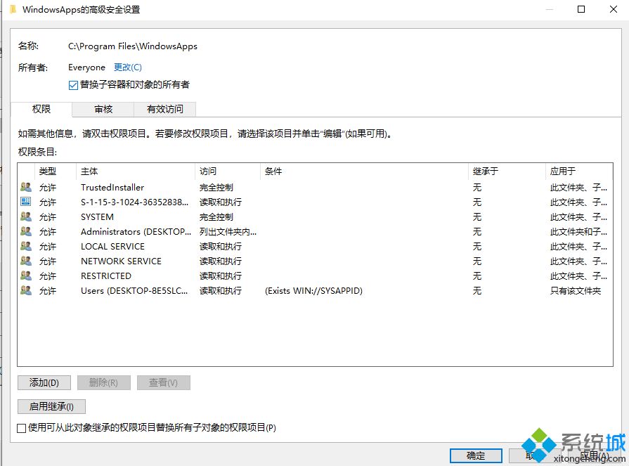 5、在“WindowsApps的高级安全设置”窗口下,勾选”替换子容器和对象的所有者”后,点击”确定“。