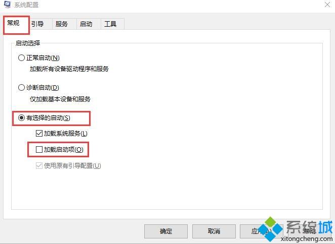 2、在常规界面中,勾选【有选择的启动】,取消【加载启动项】的勾选。